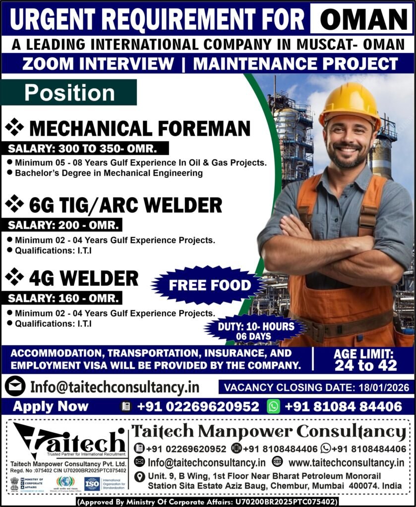 Exciting long-term opportunity in Muscat, Oman for skilled technicians in oil & gas projects! A leading international company is urgently hiring experienced professionals for immediate mobilization with attractive salaries, full company benefits, and employment visa provided.
