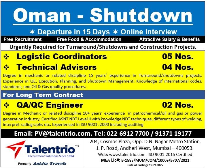 Are you an experienced professional in oil & gas, petrochemical, or construction? Talentrio Recruitment Solutions (formerly Ankita Travels), an ISO 9001-2015 certified agency, is urgently hiring for turnaround/shutdowns and construction projects in Oman. With departure in just 15 days and online interviews, this is a prime opportunity! Enjoy free recruitment, free food & accommodation, and attractive salaries & benefits for long-term contracts.