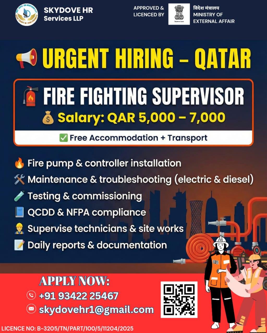 Urgent Qatar Job: Fire Fighting Supervisor – Salary QAR 5,000–7,000 + Free Accommodation & Transport