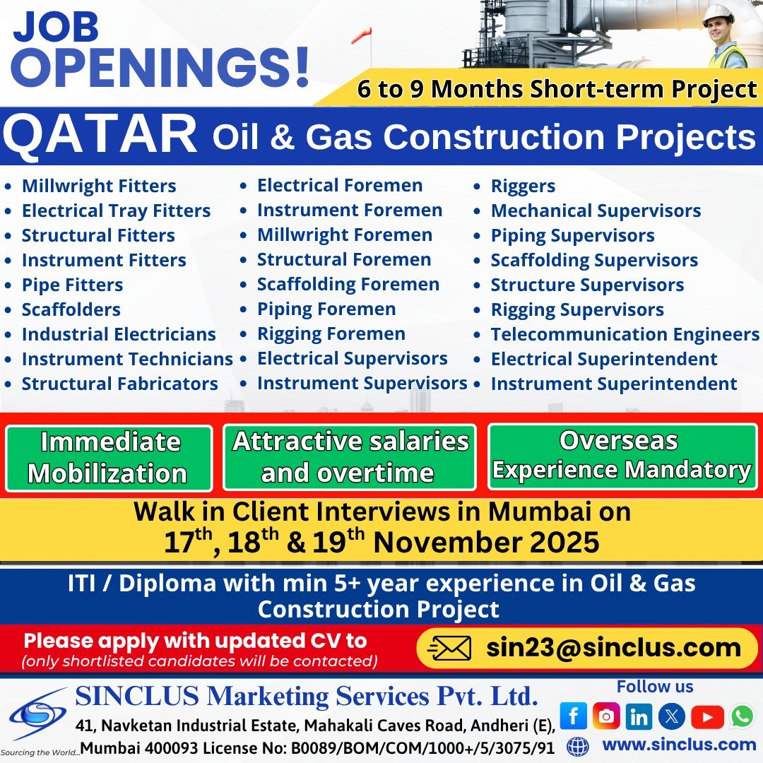 QATAR OIL & GAS CONSTRUCTION PROJECT 6–9 Months Short-term Shutdown / Turnaround Immediate Mobilization | Attractive Salaries + Overtime | Overseas Experience Mandatory Leading EPC contractor urgently requires Gulf-experienced Oil & Gas professionals for high-paying short-term project. Client face-to-face interviews in Mumbai on 17th, 18th & 19th November 2025. Only ITI / Diploma with minimum 5+ years Oil & Gas Construction experience will be considered.