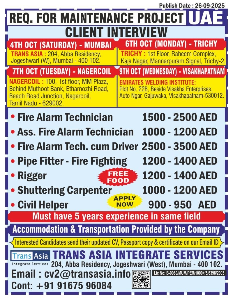 Send your CV, Passport Copy & Certificates to: cv2@transasia.info