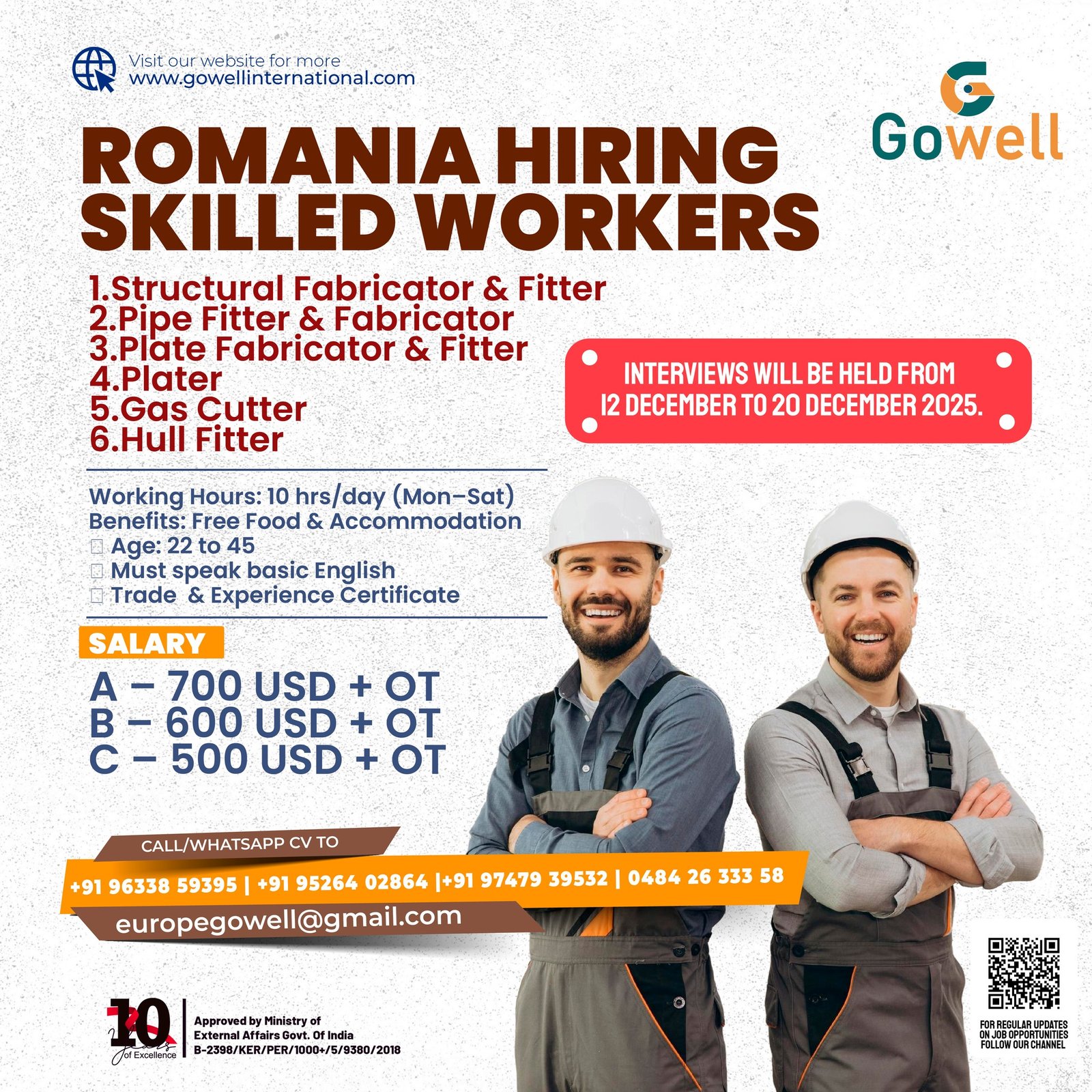 Looking for overseas opportunities in Europe? Gowell International, a licensed manpower consultancy, is urgently hiring experienced skilled workers for Romania (Schengen Zone). Positions include structural fabricators, pipe fitters, and more with competitive salaries up to 700 USD + OT, free food, accommodation, and other benefits.