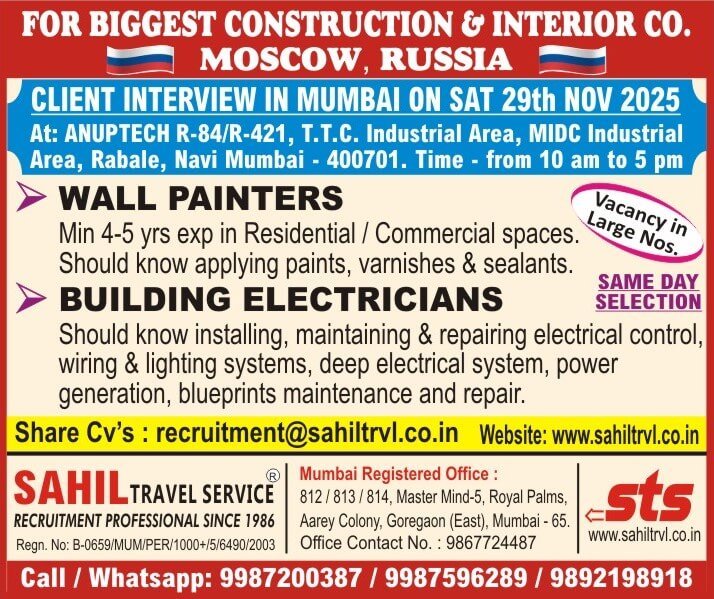 Biggest Construction & Interior Company in Moscow, Russia is conducting Direct Client Interviews in Mumbai for large number of vacancies. Same-Day Selection + Immediate Visa Processing!
