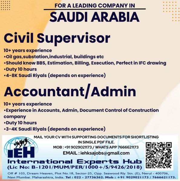 FOR A LEADING COMPANY IN SAUDI ARABIA International Experts Hub (IEH) – Govt. of India Approved (Lic No: B-1201/MUM/PER/1000+/5/9426/2018) announces urgent requirement for experienced professionals.