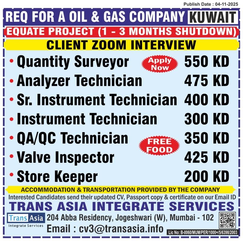 Are you an experienced Instrument Technician, QA/QC Technician, or Quantity Surveyor looking for short-term high-paying jobs in Kuwait? Trans Asia Integrate Services is hiring immediately for the Equate Project Shutdown (1-3 months duration) with client Zoom interviews.