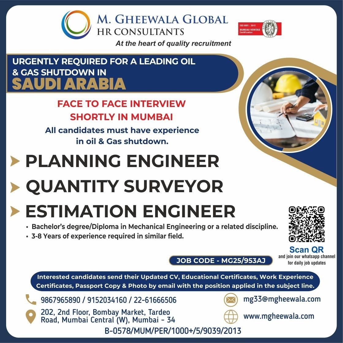 Leading Oil & Gas Shutdown Project in Saudi Arabia M. Gheewala Global HR Consultants (License No. B-0578/MUM/PER/1000+/5/9039/2013), one of the most trusted and ISO-certified recruitment agencies in Mumbai, is conducting face-to-face client interviews shortly in Mumbai for an upcoming major Oil & Gas Shutdown in Saudi Arabia.