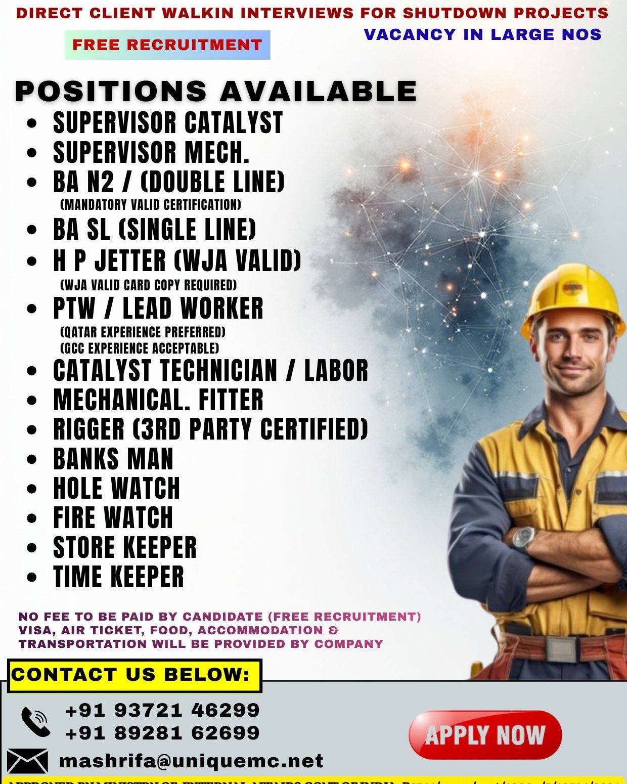 Candidates with prior shutdown experience in oil & gas, especially in Qatar or GCC countries, will be preferred. Relevant certifications (e.g., for riggers, PTW holders, hydro jetters) are mandatory for certain positions.