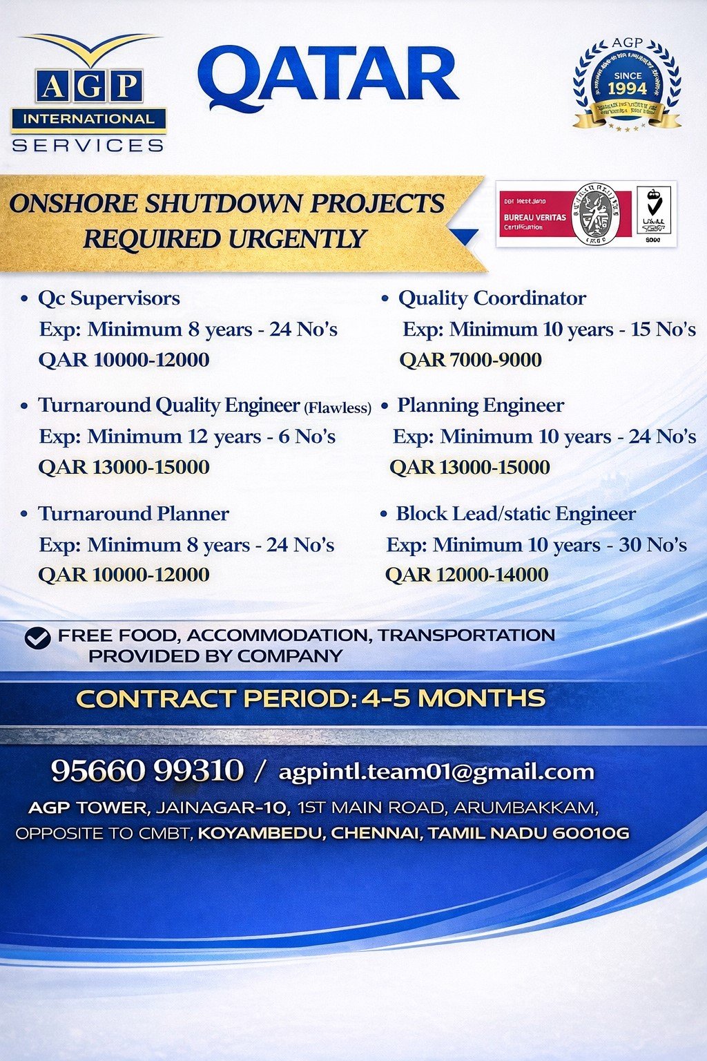 A leading company is urgently recruiting experienced professionals for Onshore Shutdown Projects in Qatar. This is a short-term contract (4-5 months) with excellent benefits including Free Food, Accommodation & Transportation provided by the company.