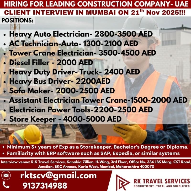 HIRING FOR LEADING CONSTRUCTION COMPANY – UAE CLIENT INTERVIEW IN MUMBAI ON 21st NOV 2025!! Top-tier UAE construction & infrastructure giant urgently recruiting workshop & heavy equipment mechanics for Dubai & Abu Dhabi projects. High salary up to 6000 AED + OT + free accommodation + food. Minimum 3–5 years construction field experience mandatory!