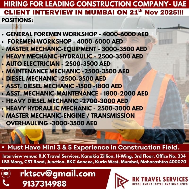 HIRING FOR LEADING CONSTRUCTION COMPANY – UAE CLIENT INTERVIEW IN MUMBAI ON 21st NOV 2025!! Top-tier UAE construction & infrastructure giant urgently recruiting workshop & heavy equipment mechanics for Dubai & Abu Dhabi projects. High salary up to 6000 AED + OT + free accommodation + food. Minimum 3–5 years construction field experience mandatory!