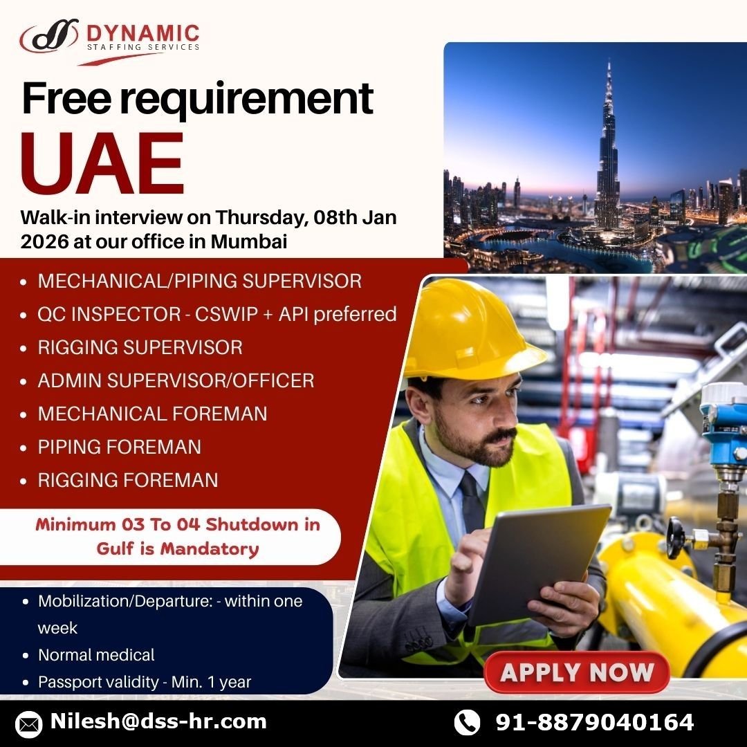 Free Requirement – Fast mobilization! Leading company in UAE is urgently hiring experienced professionals for shutdown projects with minimum 3-4 Gulf shutdowns mandatory.
