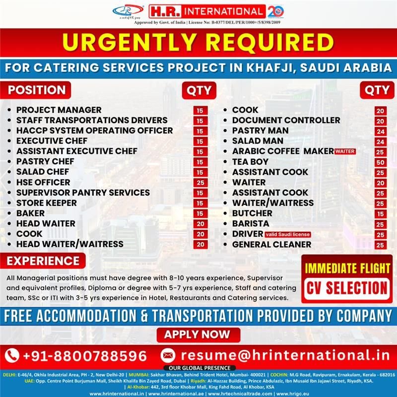 Project Manager | Executive Chef | Pastry Chef | Cook | Head Waiter | Baker | Barista | Butcher | Drivers (Valid Saudi License) | General Cleaners and many more!
