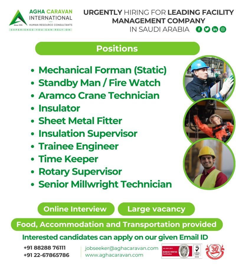 Are you looking for exciting career opportunities in Saudi Arabia? Agha Caravan International Human Resource Consultants is urgently hiring for a leading facility management company. With a wide range of positions available, this is your chance to join a reputable organization offering online interviews, large vacancies, and excellent benefits including food, accommodation, and transportation.