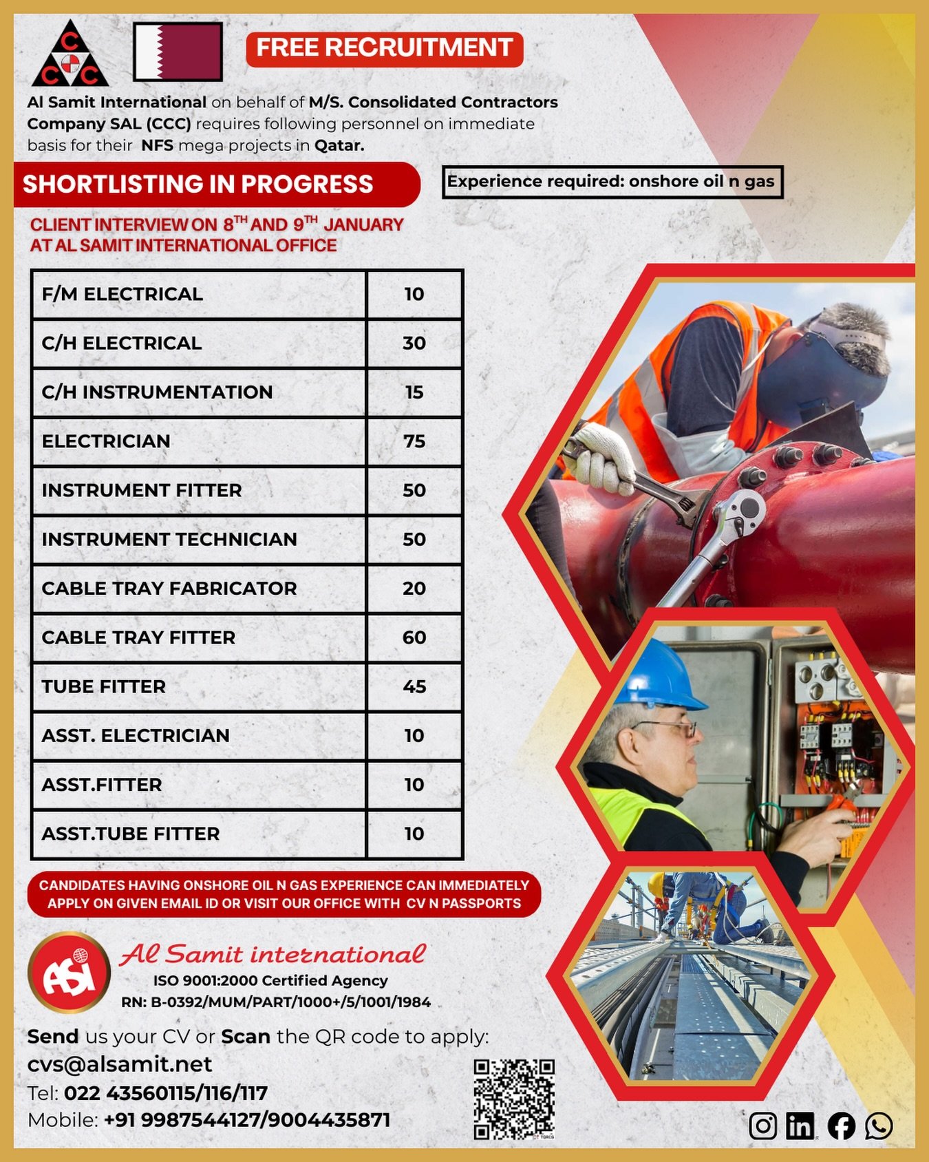 8 Hours Duty | 2 Years renewable contract | Accommodation & Transportation will be provided by the company | Medical & Leave benefits as per Qatar law | Food+OT will be provided