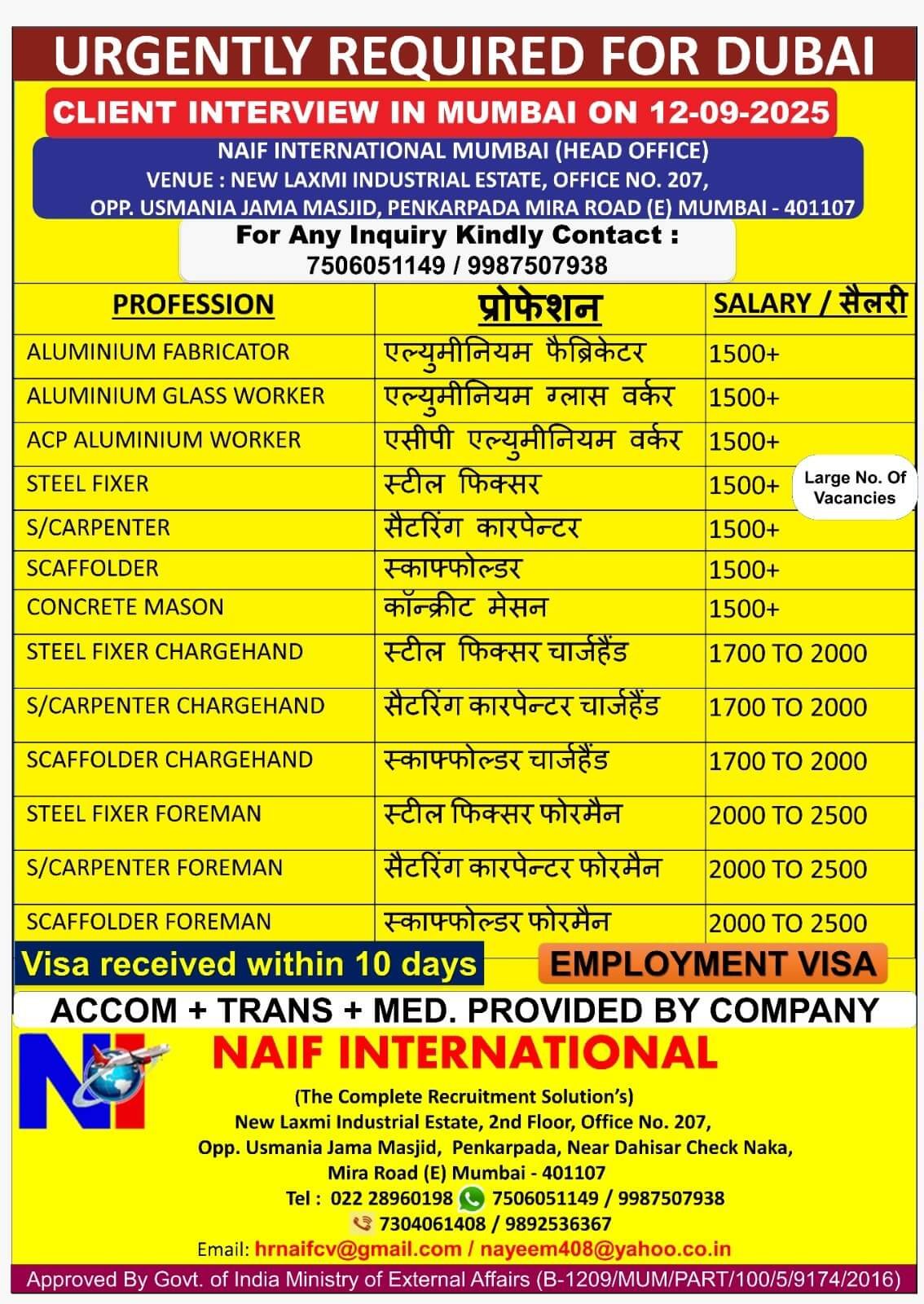 Naif International is hosting a client interview in Mumbai on 12-09-2025 for exciting job opportunities in Dubai. With a large number of vacancies and an employment visa, this is your chance to join a leading company. Apply now!