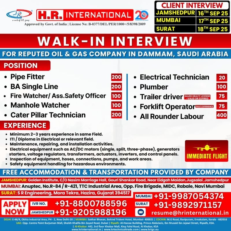 H.R. International is hiring skilled manpower for reputed projects in Dammam, Saudi Arabia
